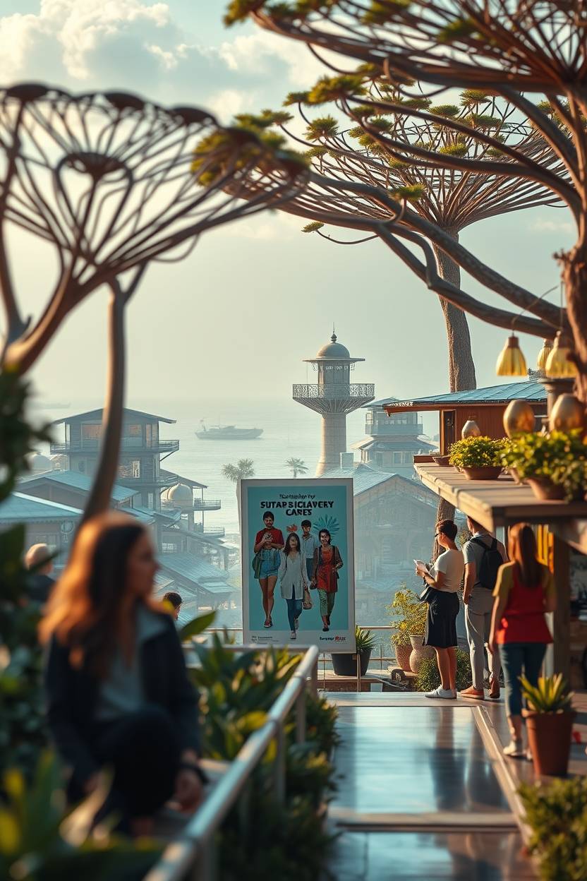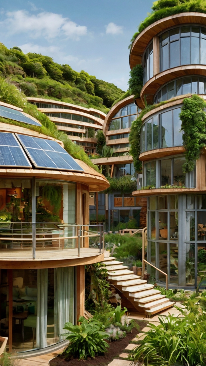 A serene landscape showcasing ancient indigenous housing that embodies proto-sustainability. In the foreground, a group of intricately designed cob houses made of earth and natural materials, each featuring rounded edges and organic shapes. The middle ground reveals a cluster of earthships, solar panels integrated into their architecture, surrounded by flourishing gardens of native plants. The background features rolling hills dotted with greenery and a vibrant sky at golden hour, casting warm light that enhances the earth tones of the structures. The atmosphere is peaceful and harmonious, suggesting a deep connection with nature. Capture this scene with a wide-angle lens to encompass the depth and beauty of the surroundings. This image is created for "The Sustainable Digest".