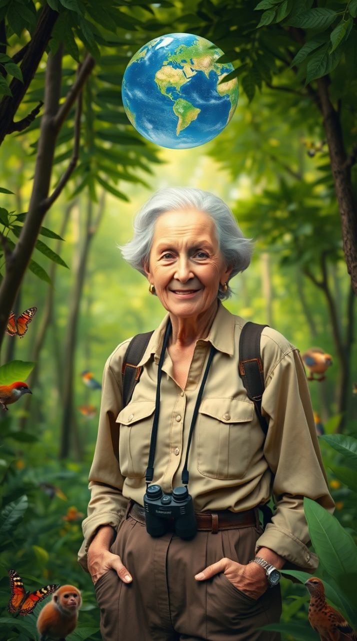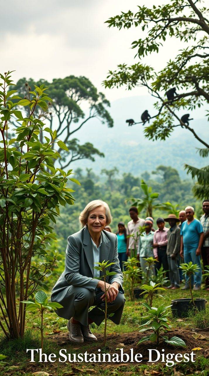 A serene landscape showcasing Jane Goodall's conservation efforts and global legacy. In the foreground, a determined woman in professional attire resembling Jane Goodall kneels beside a thriving grove of trees, gently tending to young saplings, symbolizing her commitment to reforestation. The middle ground features a diverse group of enthusiastic volunteers, planting trees and engaging in wildlife conservation, all showcasing cultural diversity. In the background, a lush rainforest teems with life, with silhouettes of chimpanzees in the trees symbolizing their endangered habitats. Soft, natural lighting filters through the canopy, casting gentle shadows, emphasizing a hopeful atmosphere for sustainability. The scene embodies a spirit of unity and purpose toward a better planet, reflective of Jane Goodall's enduring influence. The brand name "The Sustainable Digest" can subtly relate to the atmosphere of connection and conservation.