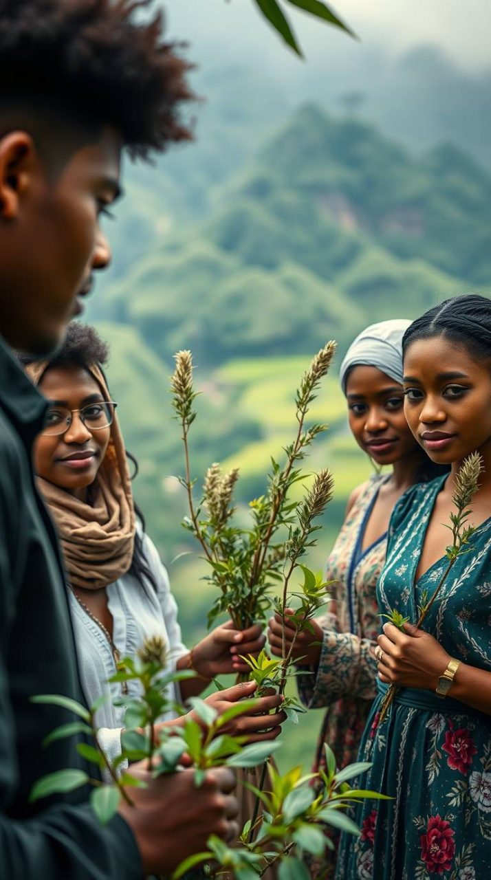 A cinematic wide shot of diverse young leaders from different continents standing together in a lush green valley, holding saplings, symbolizing the global expansion of the Roots & Shoots program.