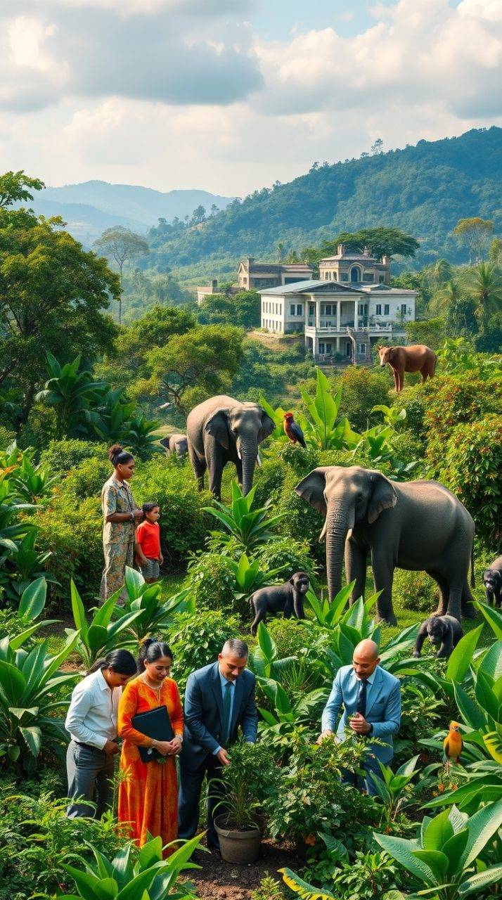 A serene landscape showcasing a vibrant wildlife habitat influenced by Jane Goodall's legacy. In the foreground, a diverse group of professionals in business attire are planting trees and collaborating on sustainable practices, symbolizing community engagement. The middle layer features a variety of jungle fauna, such as chimpanzees, elephants, and tropical birds, coexisting harmoniously within the lush greenery. In the background, a distant view of a village exemplifies sustainable development, with eco-friendly buildings amidst nature. Soft morning light illuminates the scene, casting gentle shadows and creating an uplifting atmosphere. The overall mood is one of hope, collaboration, and respect for nature, reflecting the mission of "The Sustainable Digest."